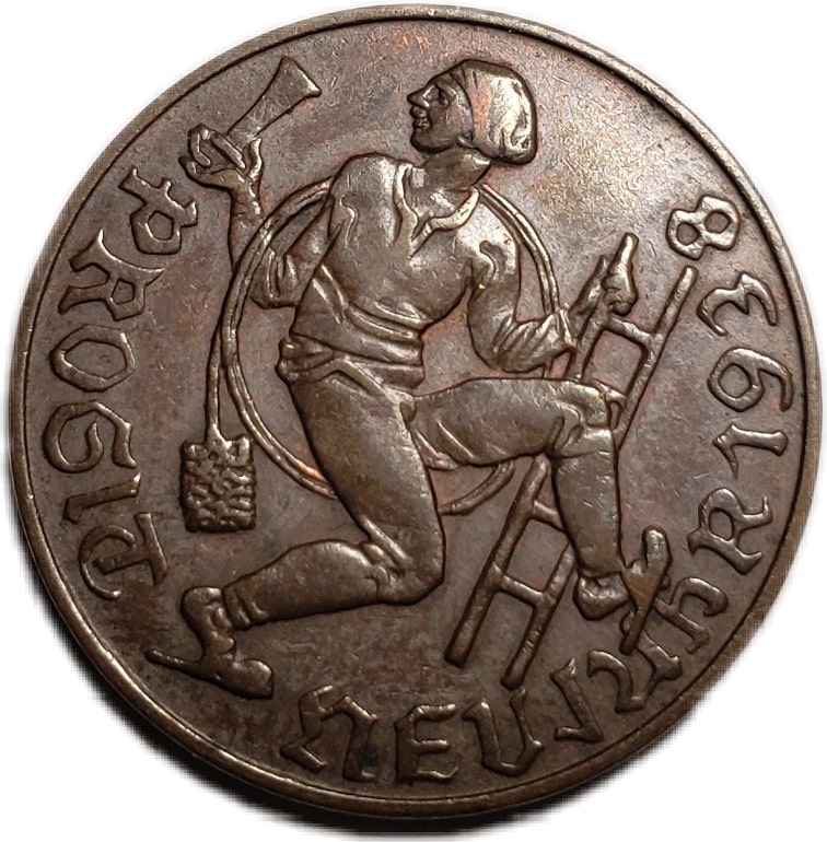 As the shopkeeper removed each tiny utensil from its hanging string, Rose looked over the items on the counter. A bowl of tokens caught her eye. She reached in and picked up one of the copper coins. She turned the coin over. Both sides were the same. Embossed in the center was a chimney sweep climbing a ladder and carrying the tools of his trade. Circling the edge was the New Year greeting, “Prosit Neujahr 1938.”