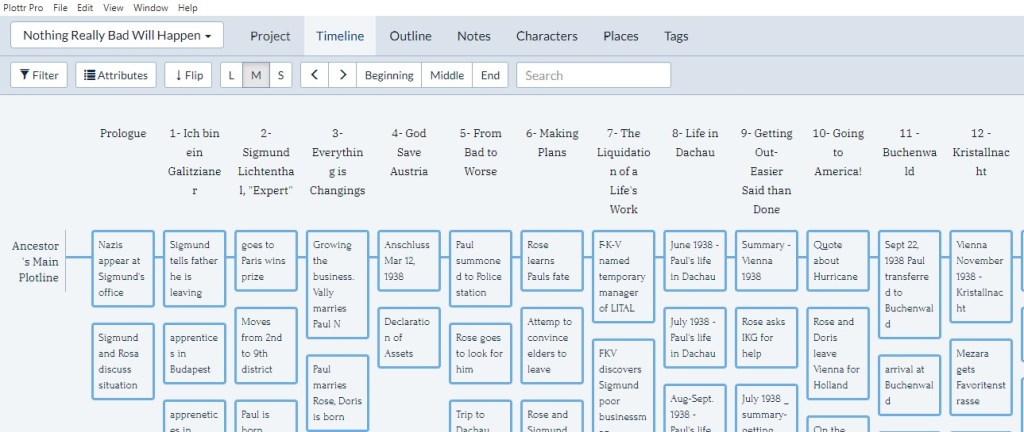 I use a software program called Plottr which is designed to help writers plot out the structure of their books. (Very appropriate name, right?) There are many templates to choose from to help you ensure your book has a structure that makes sense and keeps the interest of your readers. I’m using the Save the Cat template, which is similar to the three-act story structure we are all familiar with, but with a few more detailed scenes (also called beats) incorporated. The software makes it very easy to add, delete, or move scenes around without a lot of the cut-and-paste necessary when writing in a word-processing program.