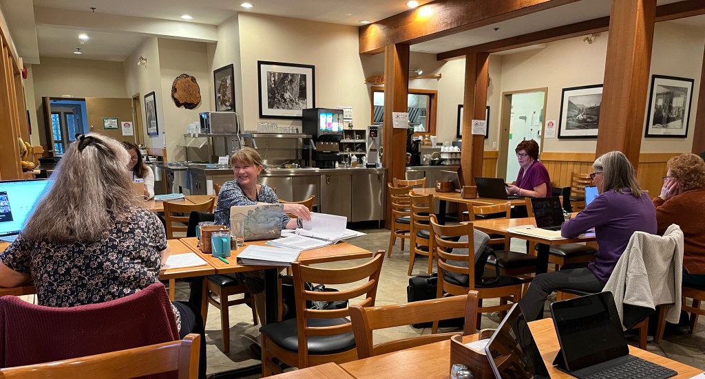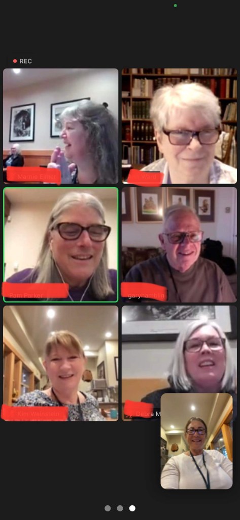 We each found a spot in the dining room to spread out and get to work. But first we logged on to our Writing Sprinters zoom and wished Gary a happy birthday!