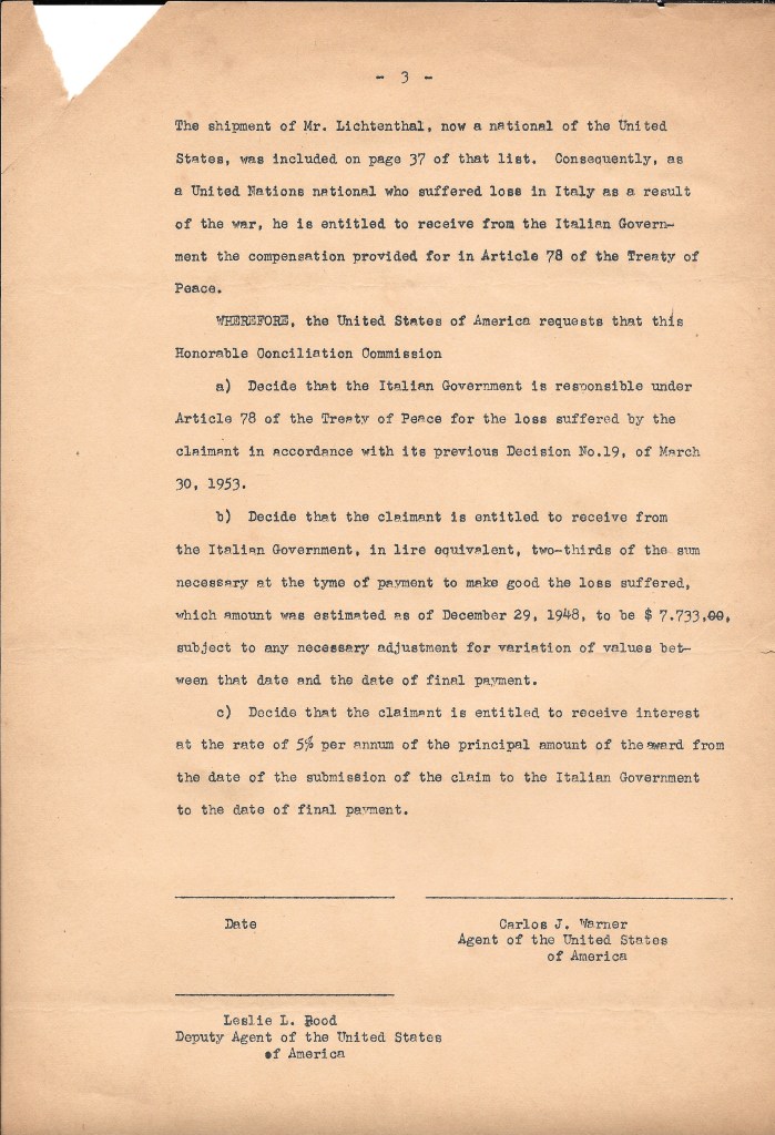 - Click on the images below to view Sigmund’s 1948 affidavit related to his suit against the Italian government for the loss of items in the storage container (also referred to as a liftvan)